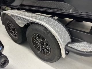 Custom bunk tandem axle trailer w/diamond plating and folding tongue. Load guides & spare tire.