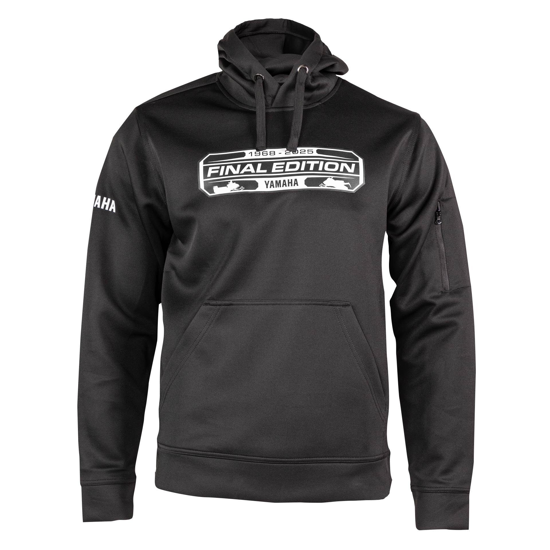 The YAMAHA Final Edition Pullover Hoodie is an essential everyday technical performance sweater for being active outdoors, on or off your snowmobile. This layering piece is a super soft, comfortable sweater that is constructed with spin dye technology for long lasting color that never fades. Its eco-friendly production process results in less water, chemical and energy consumption. Final Edition logo is visible on the chest and a YAMAHA logo on the right arm.