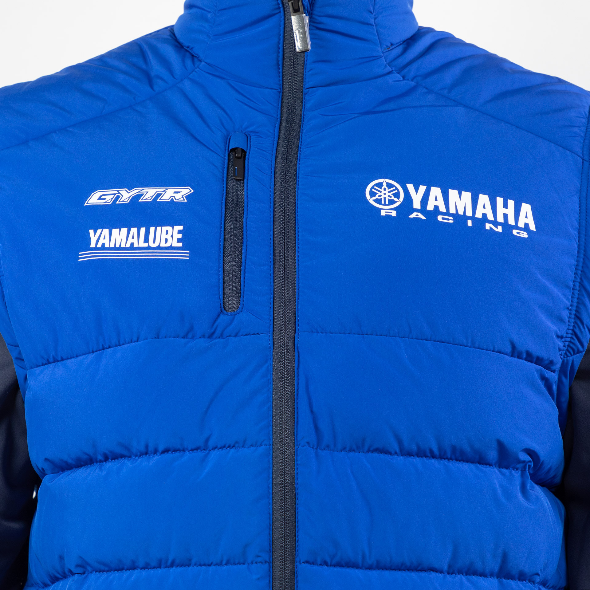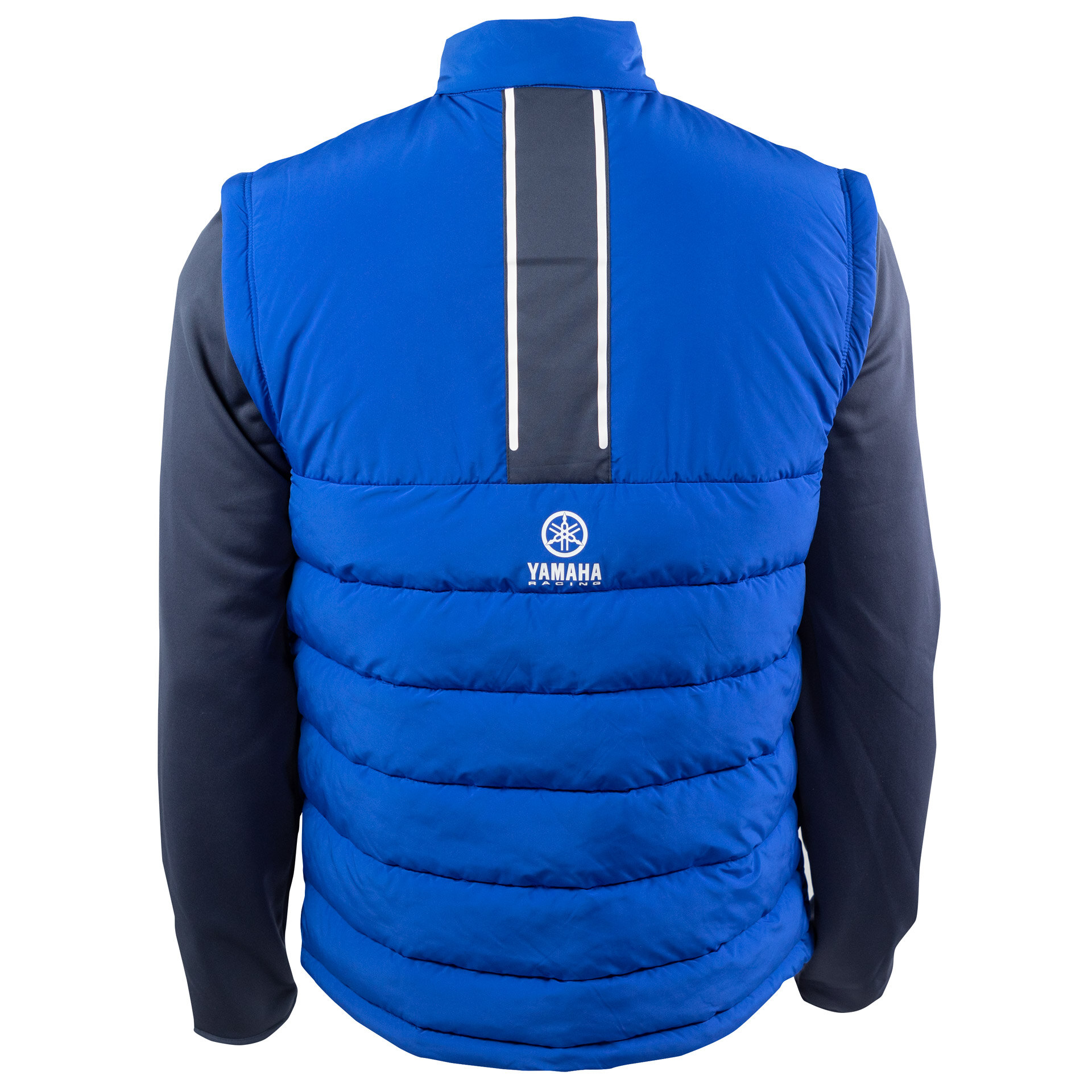 Multifunctional and perfect for changing weather, the Paddock Blue Men's Hybrid Jacket is a 2-in-1 item for day to day wear. 100% polyester throughout in two-tone blue, the puffer jacket body is padded inside and features removable softshell sleeves to transform the jacket into a bodywarmer. Printed Yamaha branding on the chest and back complete a classic Paddock Blue look.